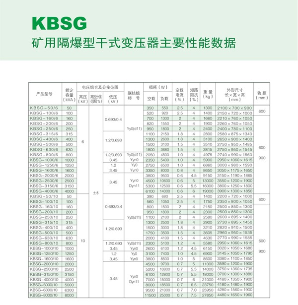 礦用隔爆型干式變壓器KBSG由箱殼、箱蓋、鐵心裝配、絕緣裝配、高壓引線、低壓引線及鐵路軌道用小車組成等組成。